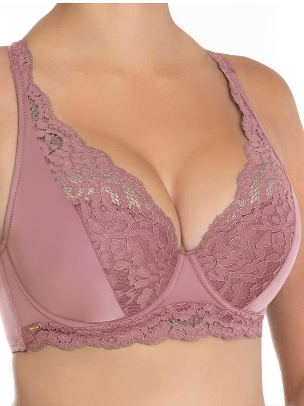Bonito sujetador con aro con copas de espuma hecho de lycra color malva con escote profundo combniado con encaje en el escote. Contorno de lycra lisa con tirantes ajustables en altura y cierre con ganchos de metal sin nichel. El ancho del contorno y del trante va acorde con a talla cuanto mas grande más ancho y se pueden cruzar.
