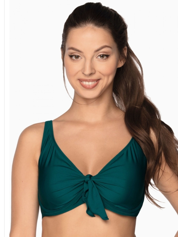 Sujetador de bikini co aros sin relleno hecho de lycra lisa color verde esmeralda. Modelo ligero y suave con un interesante ribete en la parte delantera, tirantes fijos y cierre con broche en la parte de atras. Fabricado de un material único - nailon regenerado ECONYL, este es el tipo de hilo del que está hecho el tejido VITA,,este material proviene del reciclado y convierte el problema de los residuos en moda ecológica. , - gracias a la tecnología, el material es increíblemente duradero y, al mismo tiempo, muy delgado y cubre bien. Esto permite un uso cómodo, sin miedo a rozar o traslucir, no hace bolitas, - la estructura innovadora del tejido nos permite describirlo como DOS VECES más resistente al cloro, a la luz solar (UPV 50+) y a la crema solar para tomar el sol, - una ventaja adicional de nuestros trajes de baño son los materiales que tienen una barrera bacteriostática e hidrofílica (no absorben agua), - el material de secado rápido no deja una sensación desagradable de humedad en el cuerpo.