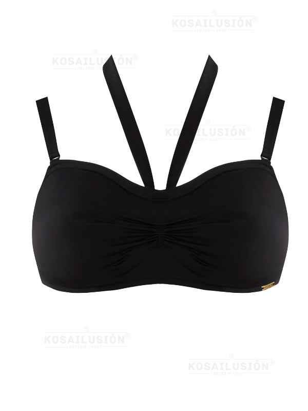 Top de bikini con aros sin relleno negro que proporcionan un excelente soporte al busto y moldean la figura. Tirantes extraíbles y ajustables, lo que permite adaptarlo a las necesidades individuales de cada mujer. Gracias a esto, el top de bikini es perfecto tanto para mujeres con pechos pequeños como grandes. El top lleva un tirante extra anudado al cuello, lo que permite resaltar el escote y la espalda. El atractivo aspecto se complementa con un práctico cierre que facilita ponerse y quitarse el top