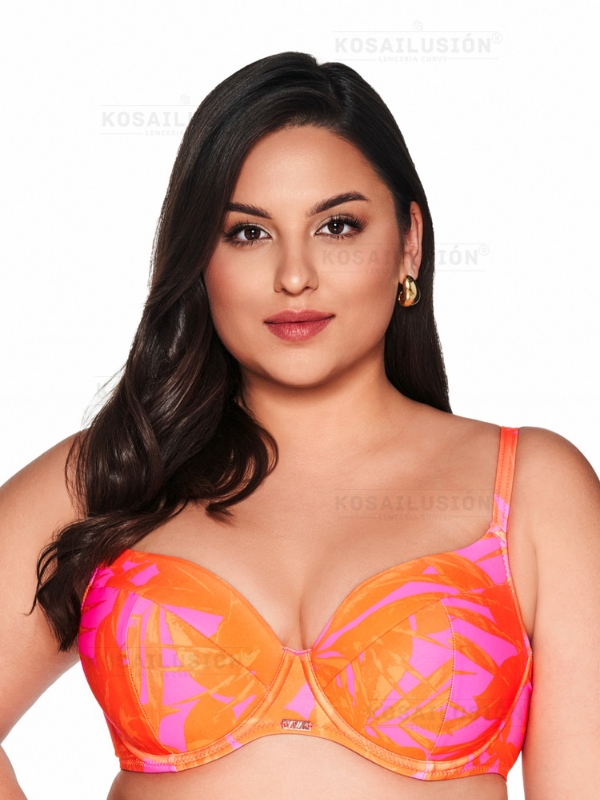 Top de bikini con aros sin relleno con forro que se seca facil y aporta perfecta sujecion. La parte del contorno tambien esta forrada. Lleva tirantes ajustables en altura, resistentes al estiramiento y cierre con broche en forma de concha.