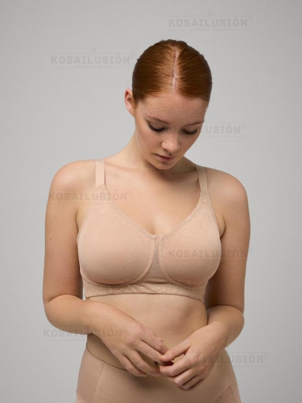 Sujetador reductor sin aros y sin relleno hecho de lycra fuerte que aporta perfecta sujeción cubierto de encaje. Lateral varilla, contorno ancho, cierre con ganchos en 5 ajustes y tirantes ajustables en altura.