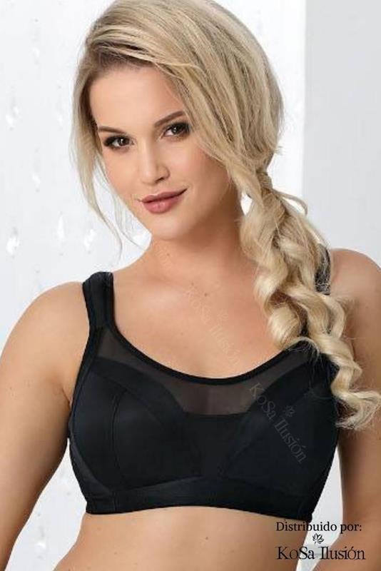 Sujetador sin relleno para deporte de alto impacto con tirantes que se cruzan. Hecho de tejido de al calidad transpirable, con parte lateral y trasera ancha. Copas hechos con tres cortes que cubre todo el pecho aportando un perfecta sujeción y acabado con malla en el escote.