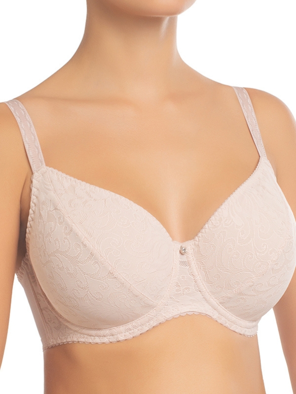 Sujetador con aro sin relleno tipo reductor hecho de lycra con motivos florales con forro para una perfecta sujeción. Tirantes de distintos anchuras según talla, ajustable en altura. Cierre con dos o 3 ganchos en tres ajustes.