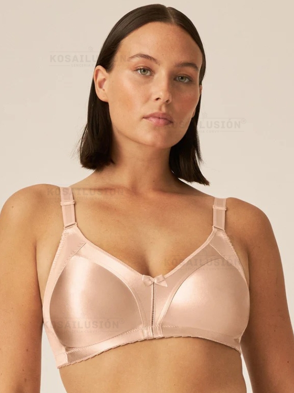 Sujetador reductor sin aros totalmente liso que no se marca debajo de la ropa, corte lateral que recoge el pecho desde la axila y cobre bien los laterales. Tirantes ajustables en altura desde la parte delantera.