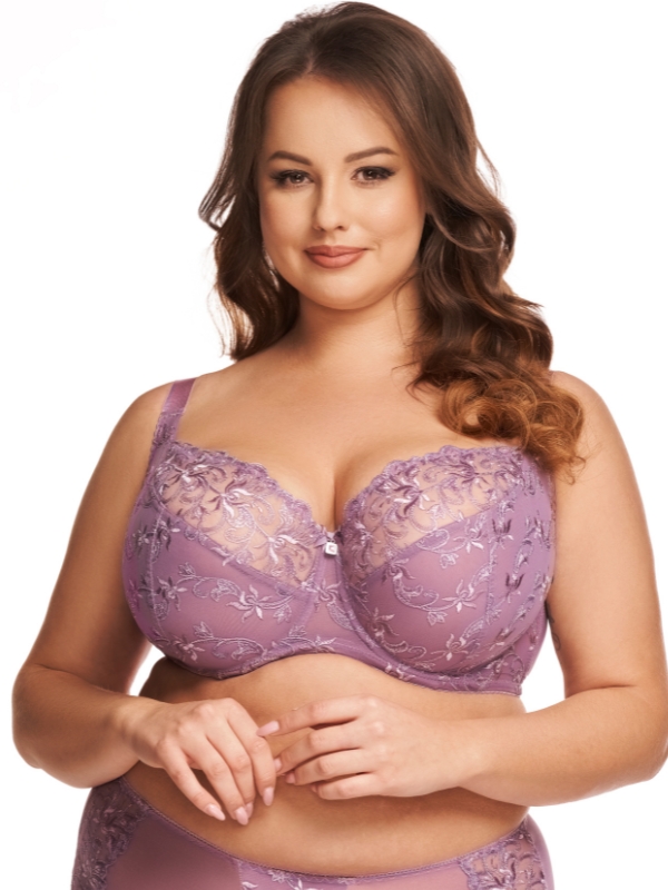 Sujetador con aros sin relleno que aporta una forma natrural rredonda, perfecta sujecion y comodidad. Hecho totalmente de encaje color malva con forro , contorno lisa y tiranes ajustables en altura y cierre con 3 filas de ganchos.