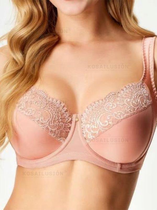 Sujetador con aros sin relleno con refuerzo en la parte de la axila para recojer y central eel pecho. Hecho de lycra color melocoton cmbinado con encaje en la parte superior de la copa. Contorno ancho, liso , cierre con gancho y tirantes acolchados super comodos.