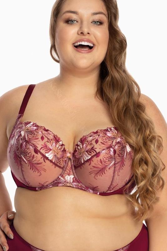 Sujetador con aro sin relleno hecho de tul transparente con bordado romantoco de flores color vino. Parte trasera lycra lisa y tirantes ajustables en altura y forma de U lo que facilita que no se caigan los tirantes del hombro.